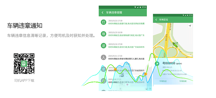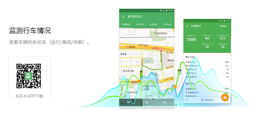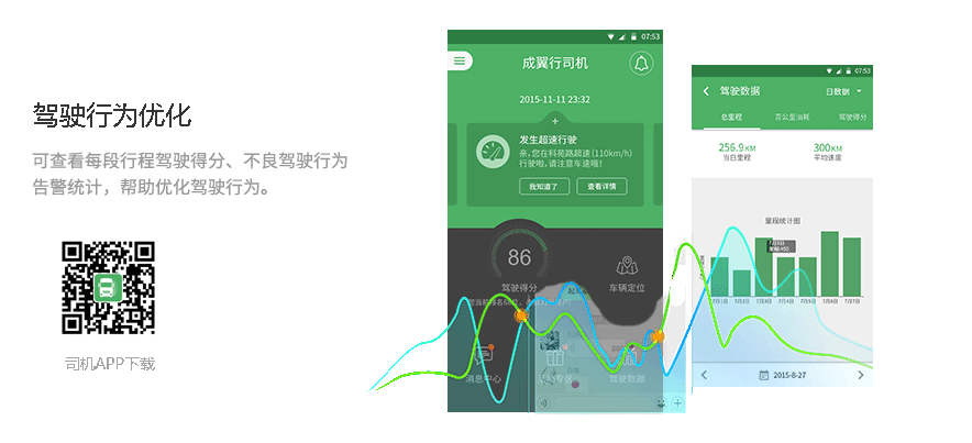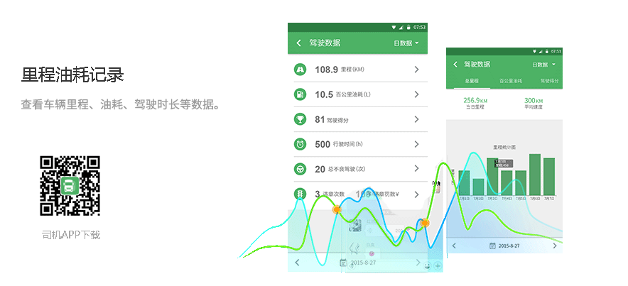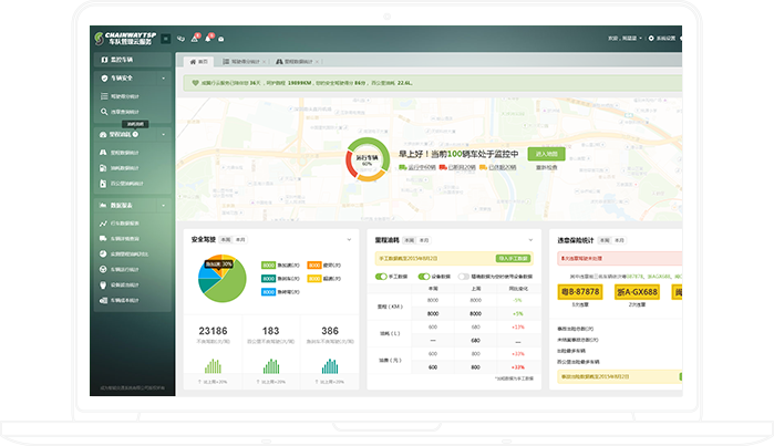 清晰呈现车辆总体运行状态,以及驾驶情况、里程油耗、违章保险统计信息。