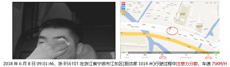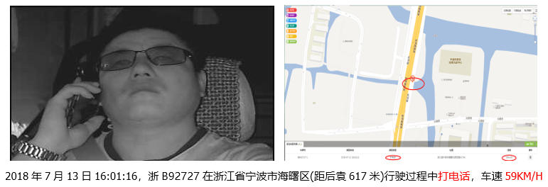通过视频分析,捕捉驾驶员车上抽烟、接打电话、疲劳驾驶、注意力分散的情况,提醒并记录违规行为的详细信息,包括车辆信息,事件触发事件,位置,车速信息等。可结合该车辆的连续运行时长、休眠时长等详细运行统计数据,进行违规操作判定。
