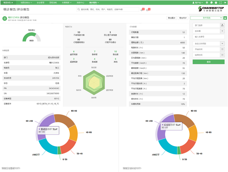 车队体检报告:从多个维度对车辆的数据进行分析,包括:车辆信息、里程轨迹、驾驶得分、不良驾驶行为、速度变化趋势、怠速时长、车辆利用率、事故次数等。